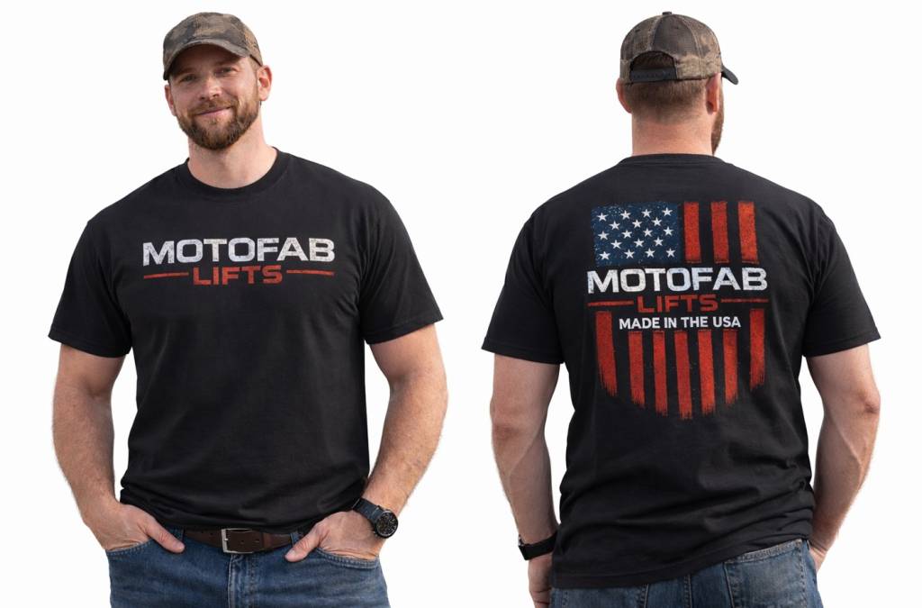 Show your pride in American-made performance with the MotoFab Lifts tee. This premium black t-shirt features the bold MotoFab Lifts logo on the front and a distressed American flag graphic with “Made in the USA” on the back. Built for comfort and everyday wear, it’s perfect for the shop, the trail, or representing your favorite lift kit brand wherever you go.